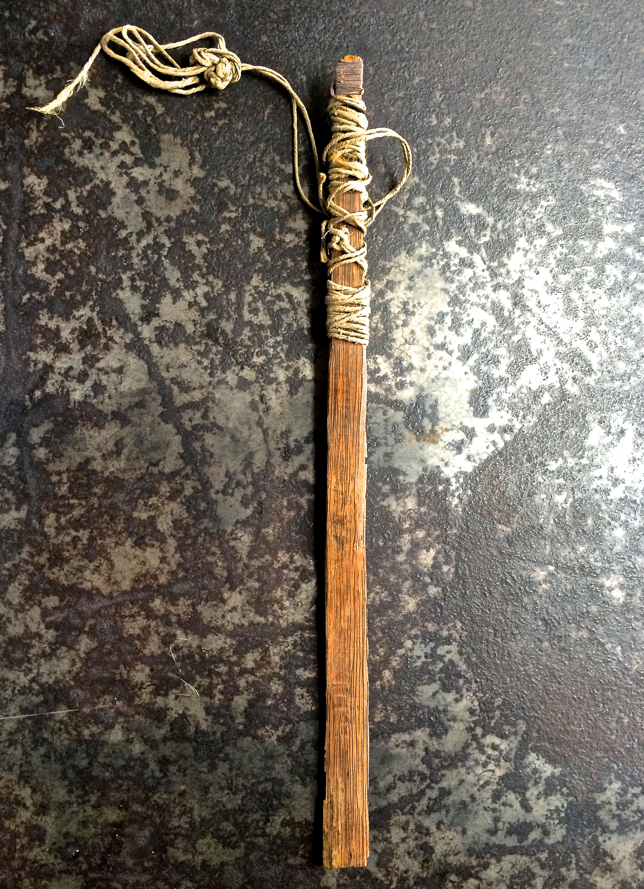 Once this was a subject of prolific anthropological debate, this complicated relationship between the playing of a bullroarer and its sounding, in which the instrument became spirit voice or mask, a collusion maintaining the structure of a society, the way in which women, men, children, non-human entities and barely imaginable beings negotiated each other’s space. The object or sculpture of the playing – to whirl a strip of wood in circles – was the small spark that lit the raging fire.
