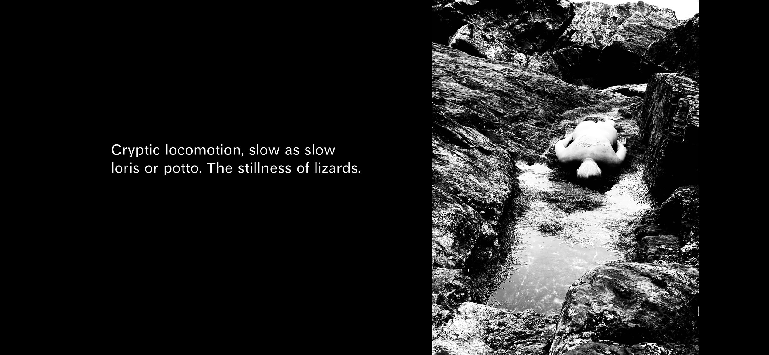 From moment to moment, exercising care between nothing and not-nothing, a breath sound of stillness and silence where the imperceptible threshold is encountered. Movement in stillness, sounding in silence, air vibrating. The body is becoming, entering the knowledge of undefined, not-knowing, its presence bringing air to materials and space.