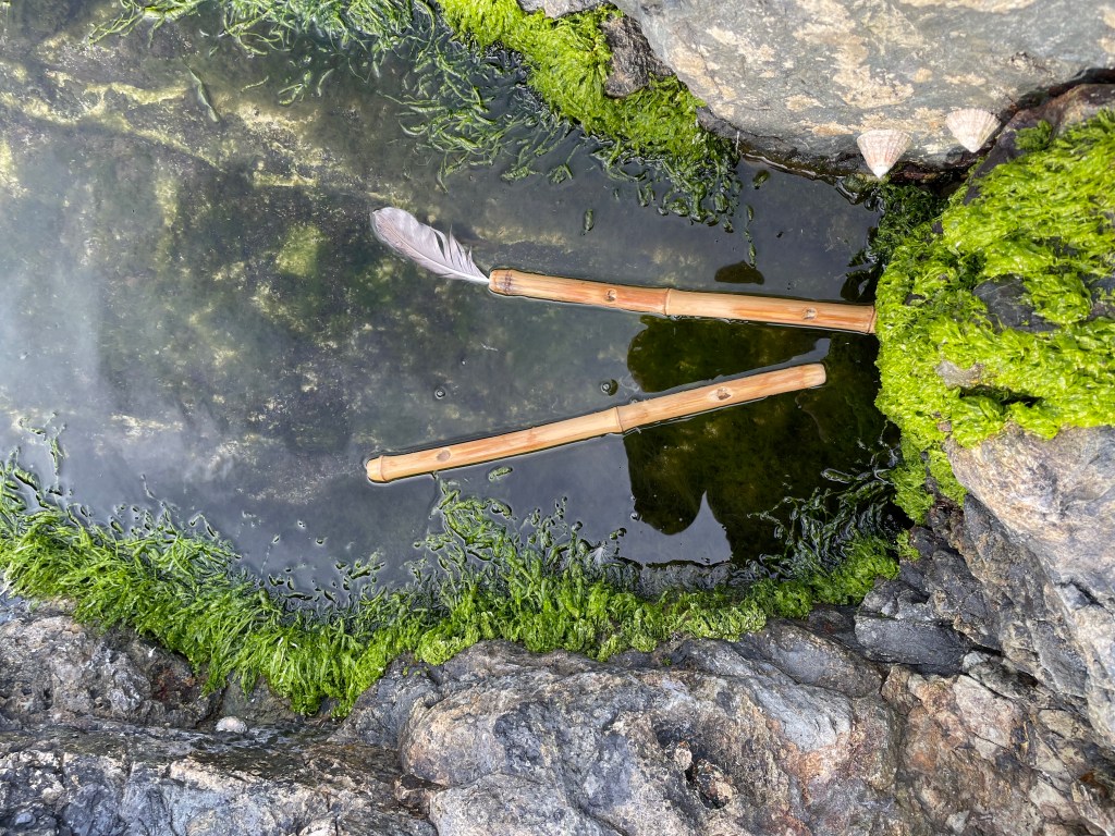 Movement is friction. A large dry leaf skitters along the pavement, sounding movement, high, scratch, stutter. An animal way to enter space, leaving behind nothing, space barely disturbed. The body is altered. This body is quiet, listening, sensing and responding to the space. Two flutes drift: water and wind.