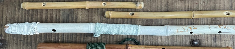 It’s not a thing for me to say I make flutes as part of my practice but make them I do, since c. 1971, in fact, when I began to search for new sounds, tunings, a reduction down to the basis of a sounding device: a single sound that can be shaped and modified yet remains itself. I made a new one last week, the one at the bottom of the above image. The bamboo had been waiting for a long time. I needed the impetus to make those small adjustments that transform a length of suitable bamboo into a flute that I can use in performance. The impetus came from two sources, of which more in a second, and in the making there were accidents that forced me into a double flute derived from two distinct groups: transverse with one open end, closed at the other; notched flute with closed end (see photograph below).
