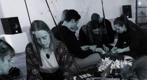 Gradually, patterns emerge in the sound, lulls falling mysteriously, overtaken by industrious surges. A Max patch is at work. Now the sound piece thins, leaving a sparse acoustic crackle that exactly matches the quick, concentrated effort of the folders. Their number has grown to fourteen. This is a durational piece – four hours at this point – so some of them have returned from a break. The atmosphere of dedication is the focal point that holds it all within its shape and volition, no obvious breakage points other than the sight of doing and making, the growth of birds.